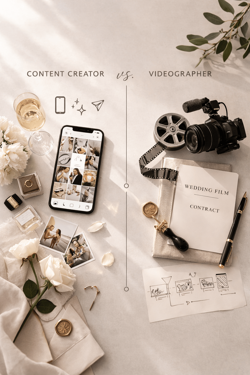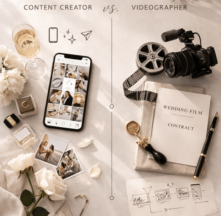If you are planning a wedding, you have probably seen both terms everywhere. Wedding videographer. Wedding content creator. At first glance, they sound similar. They both film your day. So what is the difference?